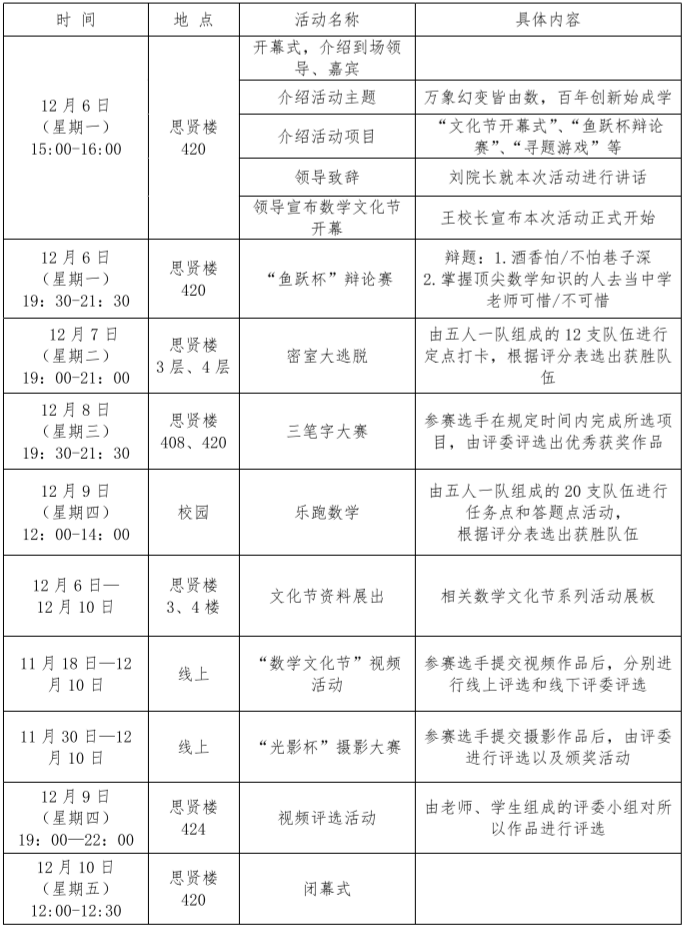 为大力弘扬数学文化,积极响应国家“大众创业,万众创新”的号召,进一步提升我校大学生的数学素养、创新意识和实践能力,在成功举办了三届数学文化节并取得丰硕成果的基础上,数学与信息科学学院认真贯彻落实学校关于“加强学科内涵建设”和“创新创业”的文件精神,以“数学文化”和“创新创业教育”为抓手,拟定于2021年12月6日至12月10日在高新校区举办腾博官网诚信为本专业服务第四届数学文化节暨创新创业系列活动,以期通过本次活动在学校营造出良好的数学学习氛围,并展示数学与信息科学学院近几年专业建设的部分特色成果,进一步推动学院人才培养工作的高效和持续发展。本次活动以“万象幻变皆由数,百年创新始成学”为主题,主要分为11个板块,分别为“文化节开幕式”、“鱼跃杯辩论赛”、“寻题游戏”、“数字涂鸦”、“密室大逃脱”、“三笔字大赛”、“乐跑数学”、“文化节资料展出”、“视频活动”、“摄影大赛”、“文化节闭幕式”。