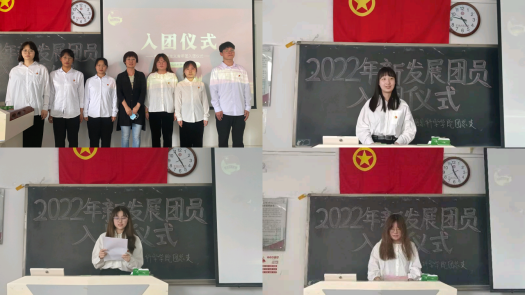 入团仪式在雄壮的国歌声中拉开帷幕。李萍宣读2022年发展团员名单,王欢为6名新团员颁发、佩戴团徽。由团总支副书记安彤领誓,新老团员面向鲜艳的共青团团旗进行了庄严的宣誓。随后团员代表杜宾利讲述了自己加入共青团的体会和成长经历,并对新团员的发展提出了一些建议;新团员代表刘紫茹讲述了自己对共青团的认识和感受,并郑重承诺将在以后的学习、生活中努力践行团员义务,接受团组织的考验与考察