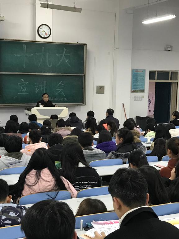 12月13日下午,数学与信息科学学院在思贤楼420教室举办党的十九大精神宣讲会。本次宣讲会特邀我校党的十九大精神党委理论讲师团成员,校党委委员,党政办公室主任田延峰主讲,会议由数学与信息科学学院党总支书记郝满义主持,数学与信息科学学院党总支副书记王欢、全体辅导员、部分教师及部分学生共200余人参加了本次宣讲会。