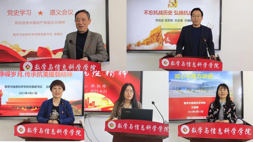 分享会上,学院党委书记郝满义以《党史学习教育----遵义会议》为题,从遵义会议的历史背景、过程和决议、历史地位、精神内涵、重要启示、现实意义等6个方面,对遵义会议进行讲解,并结合自身实际,畅谈了今后工作的设想和思路。学院院长 刘淳安以《不忘抗战历史 弘扬抗战精神》为题,从抗日战争大事记、抗日战争英雄谱、伟大的抗战精神等三部分,对抗战精神进行了阐述,在今后的工作中立足新发展阶段,贯彻新发展理念,构建新发展格局,深刻理解我国高等教育改革的趋势和内涵,发扬抗战精神,不断提升自己的业务水平和能力,推动学院各项工作高质量发展。其他党政领导也以《铭记峥嵘岁月,传承抗美援朝精神》、《邓小平南方谈话》、《伟大抗疫精神》为题,从党的百年历史中汲取担当责任的动力和攻坚克难的能力,坚定理想信念,传承红色基因,发扬奋斗精神,勇于担当、善于作为,全力推动学院“十四五”开好局、起好步,以优异成绩庆祝建党100周年。
