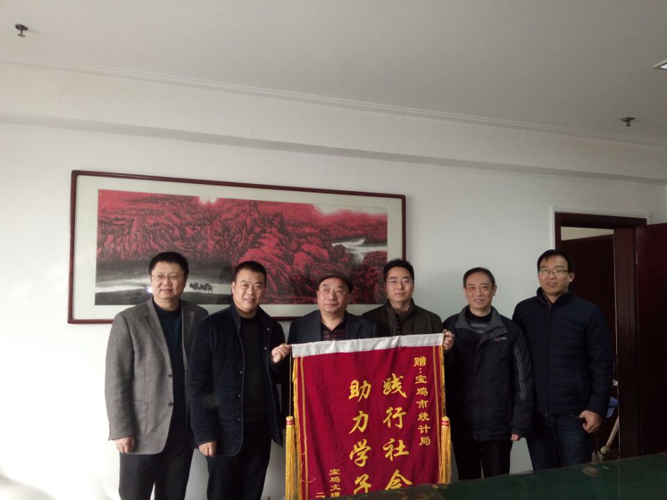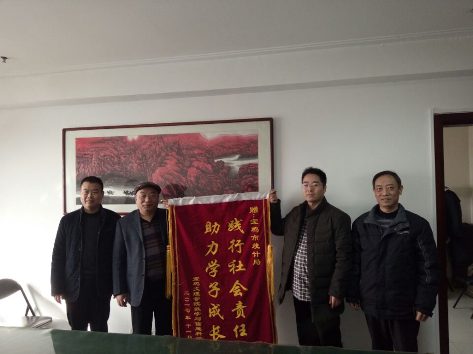 12月26日上午,我院党总支书记郝满义、院长李剑、副院长刘淳安、办公室主任王向锋一行前往宝鸡市统计局,感谢统计局对此次实践教学活动的支持和帮助,同时赠送了我院精心准备的锦旗“践行社会责任,助力学子成长”。统计局局长张宁,调研员田海宁,办公室主任胡维强等相关人员热情接待了我院领导,并进行了友好热烈的交谈。张宁局长对本次实习的学生表现给予了充分肯定,并表示希望今后继续合作,共同育人,培养适应统计行业需求的高素质全能型人才,为宝鸡的经济建设填砖加瓦。