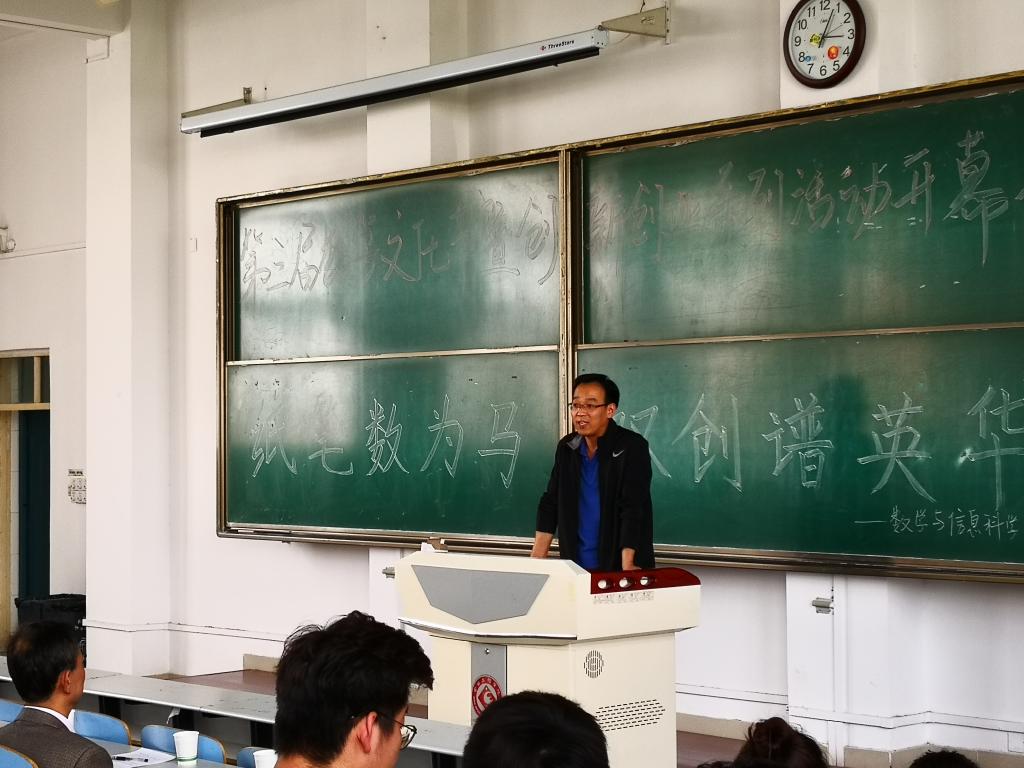 开幕式上,田延处长为我院获批的创新创业团队刘淳安围绕本届数学文化节暨创新创业系列活动的主题——“纸笔数为马,双创谱英华”对本届活动中“三笔字竞赛、趣味数学知识竞赛、考研经验交流咨询、奔跑吧数学及大型数学文化与创新创业宣传展板”5个块做了详细介绍,并对创新创业团队提出了三点要求一是要加强对学生创新创业教育的重视和引导二是要关注并引导学生积极参与创新创业活动三是要借助创新创业团队平台,结合学校特色,更好的服务地方经济建设;同时向全校师生发出邀请,希望我校学子能珍惜此次数学文化节暨创新创业系列活动的机会,积极参与、锻炼自己、展示自己。
