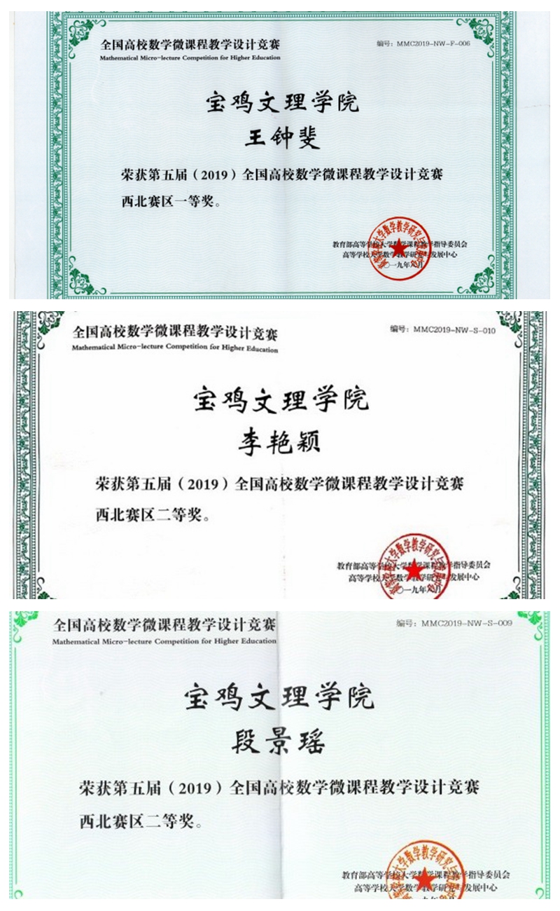 近日,第五届(2019)全国高校数学微课程教学设计竞赛决赛成绩揭晓。我院教师王钟斐荣获西北赛区一等奖,段景瑶、李艳颖荣获西北赛区二等奖。