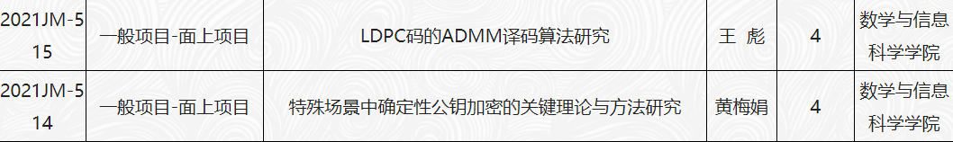立项的科研项目的学院分布情况为数学与信息科学学院获批2项,具体情况如下:
