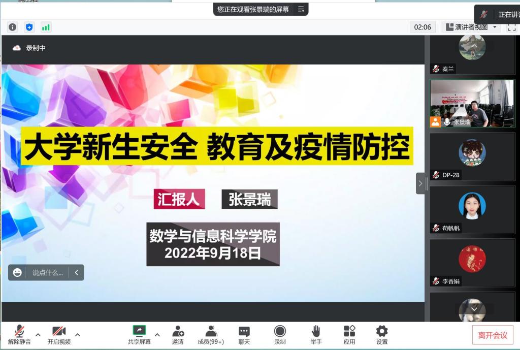 为帮助新生熟悉大学生活,克服入学焦虑,增强自我管理与自我教育意识,9月15日至9月18日,数学与信息科学学院通过线上会议平台,统筹疫情防控,聚焦新生需求,开展了内容详实、主题鲜明的2022级新生线上入学教育系列活动。
