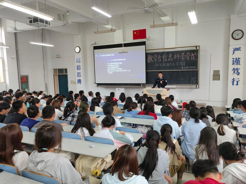 9月20日下午,我院邀请宝鸡公安局高新公安分局反诈宣传中心反诈民警王旌臣、兴业银行金融系统反诈宣传员张英子为2024级新生开展防范电信诈骗专题讲座。